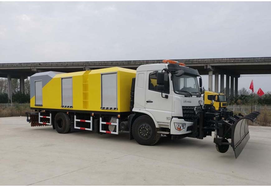 | 上裝配置 | 前置推雪鏟、中置破冰輥+除冰鏟、后置掃雪滾刷,150Kw副發(fā)動(dòng)機(jī),封閉式廂體結(jié)構(gòu)帶中部爬梯,左右各 3 個(gè)鋁合金卷簾門,尾部配備雙大箭頭 LED 指示燈+LED 顯示屏,叁段式獨(dú)立避障,每段都具有自動(dòng)上彈、自動(dòng)復(fù)位的避障功能,具有浮動(dòng)和隨路面仿形功能。除雪鏟鏟刃和破冰輥刀片高強(qiáng)度耐磨合金鋼,硬度 50-55HR。后置除雪滾刷,用聚丙烯刷毛和強(qiáng)性鋼絲混合制成。 | ||