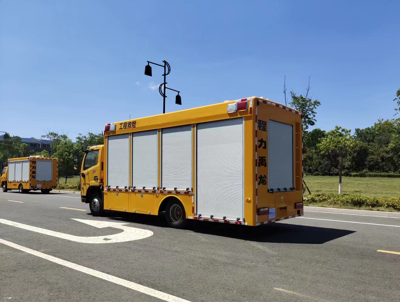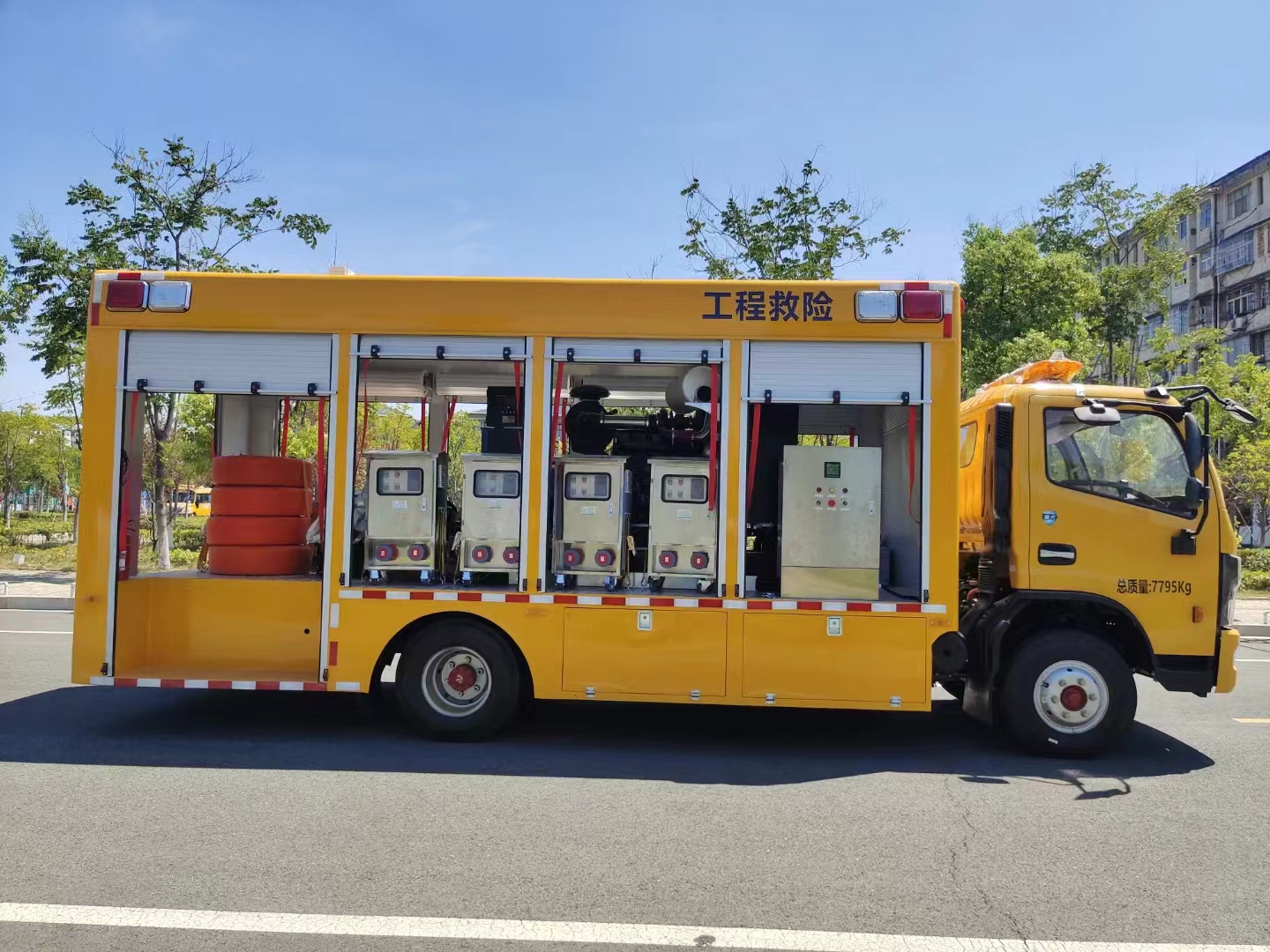 | 上裝配置 | 1、廂體外形尺寸根據(jù)實際公告標(biāo)準(zhǔn)。 廂體:具備運輸、防雨、防火、阻燃、防塵、防銹、降燥,隔震、長期抗震結(jié)構(gòu)。外部鋼材為優(yōu)質(zhì)冷軋鋼板,表面處理平整,內(nèi)襯優(yōu)質(zhì)冷軋鋼板折彎骨架,強(qiáng)度牢固,配重合理。 2、廂體一體化鋼體結(jié)構(gòu)設(shè)計, 頂部平坦。廂體采用骨架式夾層形式,外蒙皮采用厚1.5mm優(yōu)質(zhì)防銹處理的汽車專用冷軋鋼板,中間骨架采用防銹處理后的鋼管焊接,頂層、側(cè)圍內(nèi)、外層之間填充長時間使用對人體無害的防火阻燃環(huán)保吸音棉,外層鋪蓋一層阻燃金屬布,內(nèi)飾采用0.8mm厚網(wǎng)孔板。底板采用鋼結(jié)構(gòu)底框架,上表面鋪厚2mm花紋鋼板。 3、車輛廂體采用整體包覆式,廂體兩側(cè)下部設(shè)置裙邊式,全封閉式結(jié)構(gòu),頂部為圓弧型,尾部有轉(zhuǎn)向燈、剎車燈、尾燈、霧燈,箱體表面光滑平整。車廂靠駕駛室前部為休息室,休息室內(nèi)帶折疊坐椅及折疊桌,往后為機(jī)組室,機(jī)組室左、右側(cè)布置進(jìn)排風(fēng)百窗,設(shè)置機(jī)組檢修門一個,下置登車踏步梯,車廂后端為后為卷簾門。右側(cè)排風(fēng)百葉窗下部為維修觀察艙門。左側(cè)下圍設(shè)置有工具箱及功能艙門等。右側(cè)下圍設(shè)置有汽車油箱艙、液壓控制艙等。 4、車廂尾部配置標(biāo)準(zhǔn)儲物貨架讓出水帶、加長電纜等附件存放有序、互不干涉,讓緊急排水搶險變得更加快捷、有效。 5、廂體噴漆:工程黃,與車頭同一顏色; 6、最終的門數(shù),形式,打開方式嚴(yán)格按照合同要求依據(jù)程力公告生產(chǎn); | ||