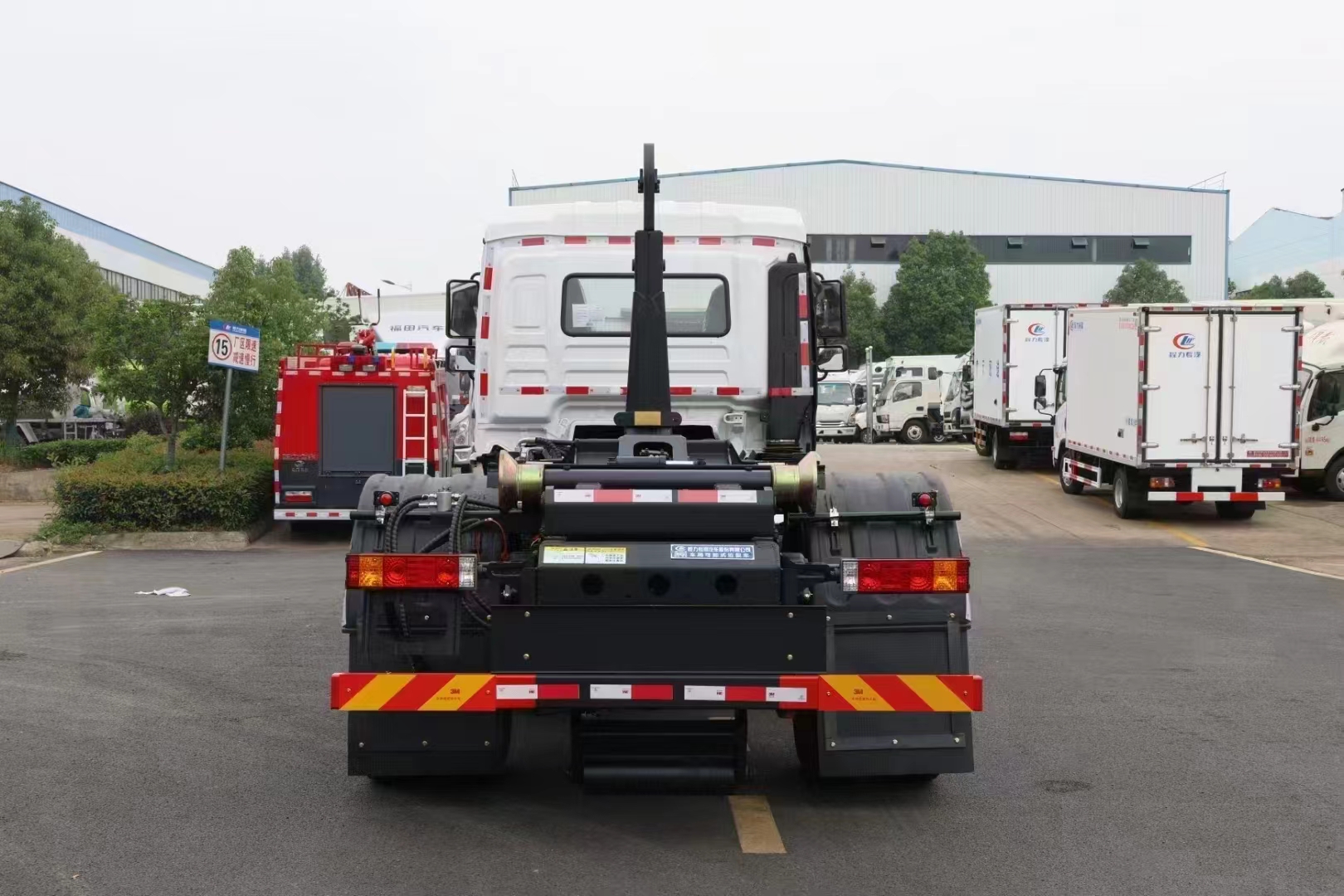 上裝配置 配套14-16方勾臂垃圾箱或移動站,主勾臂由高強度板材制作,雙油缸控制,伸縮式主臂,加強型上裝結構,液壓支腿,橫向鎖緊,品牌多路閥,進口柱塞泵,標配室內外操作(帶遙控),防誤操作,帶平衡閥,液壓鎖。